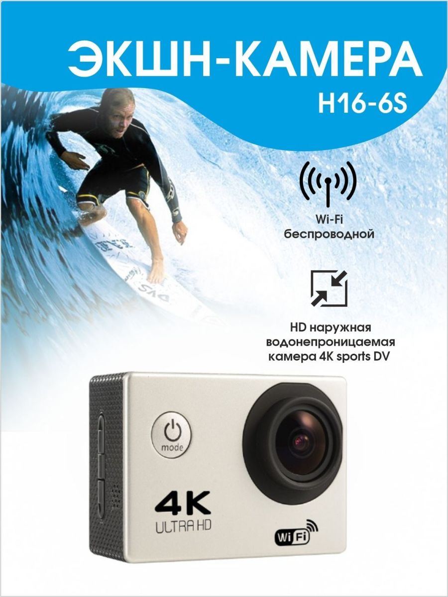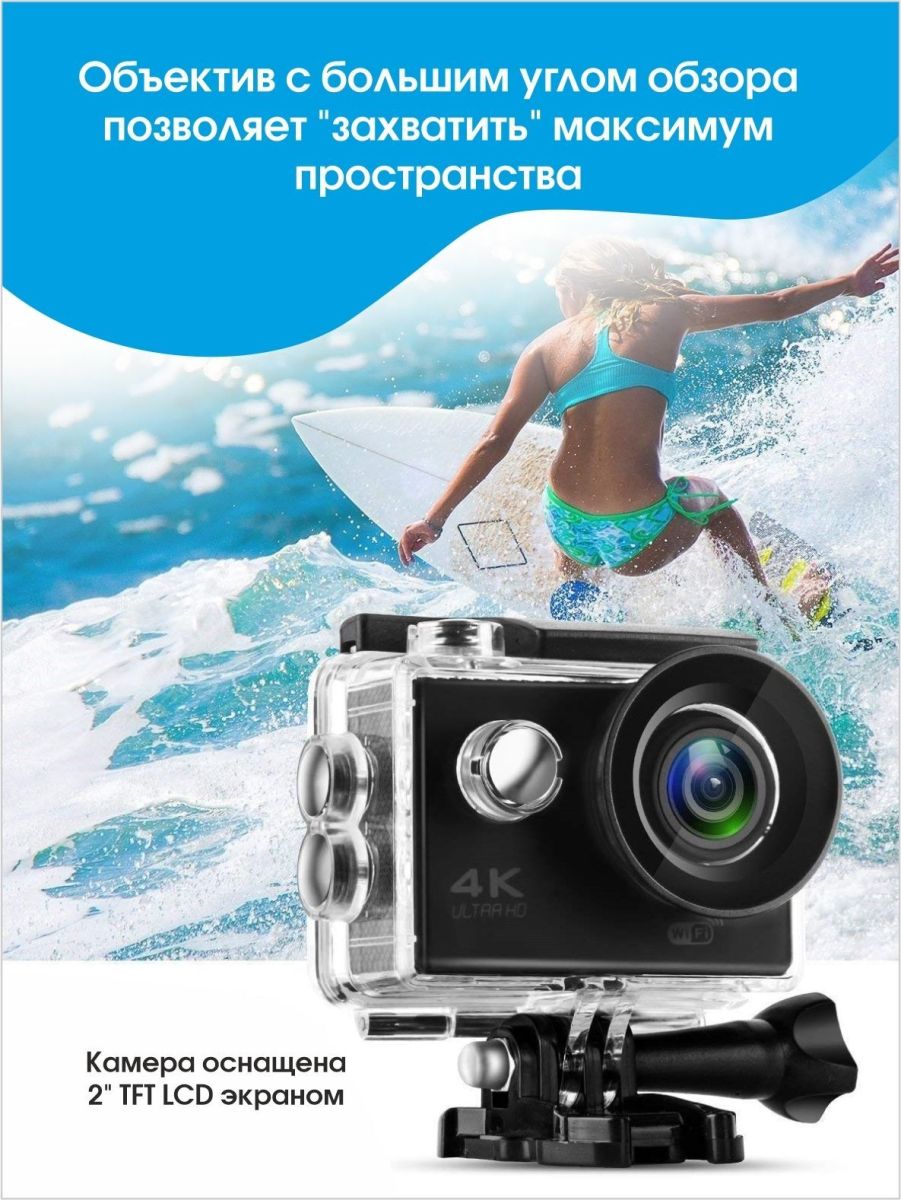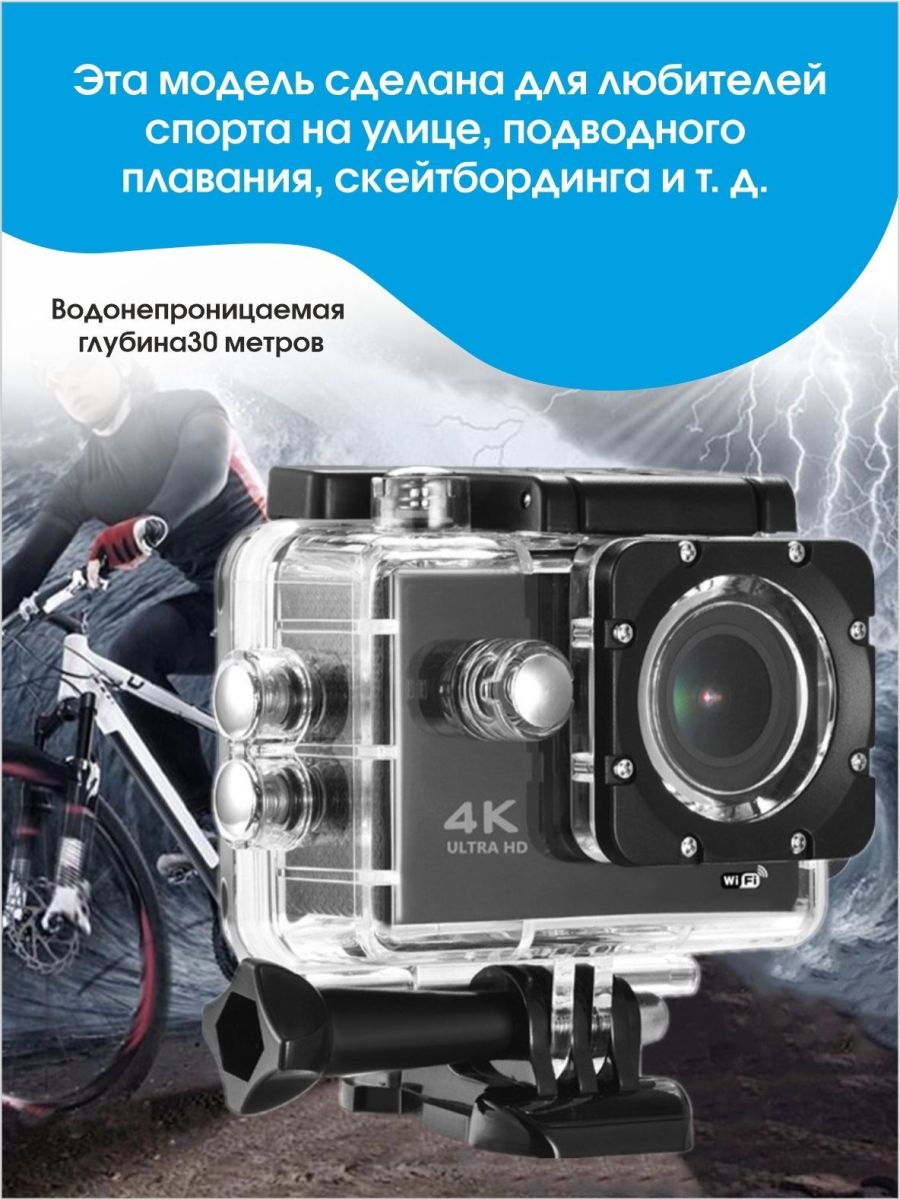 Экшн камера Ultra HD позволяет записывать видео с разрешением 4К и очень плавным изображением до 60 кадров в секунду. Камера оснащена 2" IPS экраном. Эта модель экшн-камеры сделана для любителей спорта на улице, подводного плавания, скейтбординга, скай-да