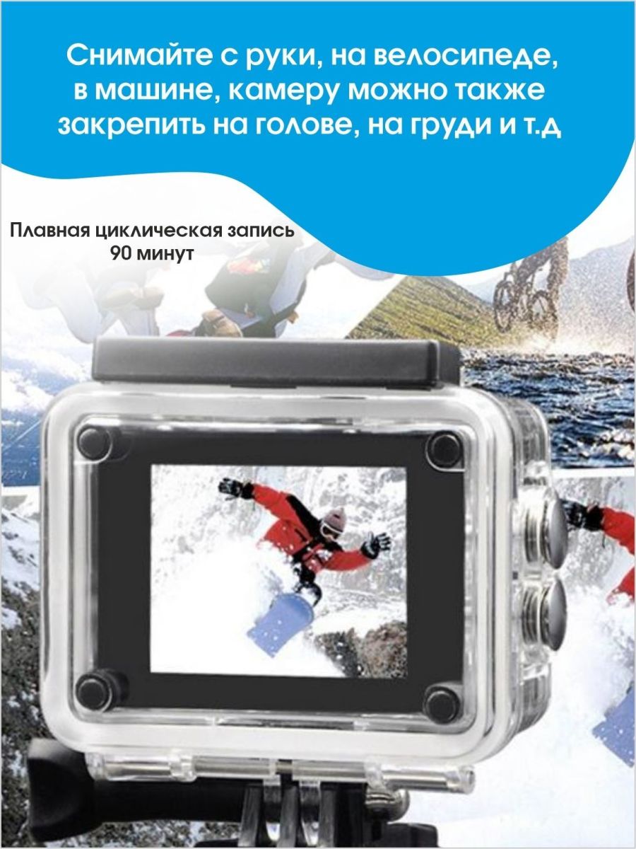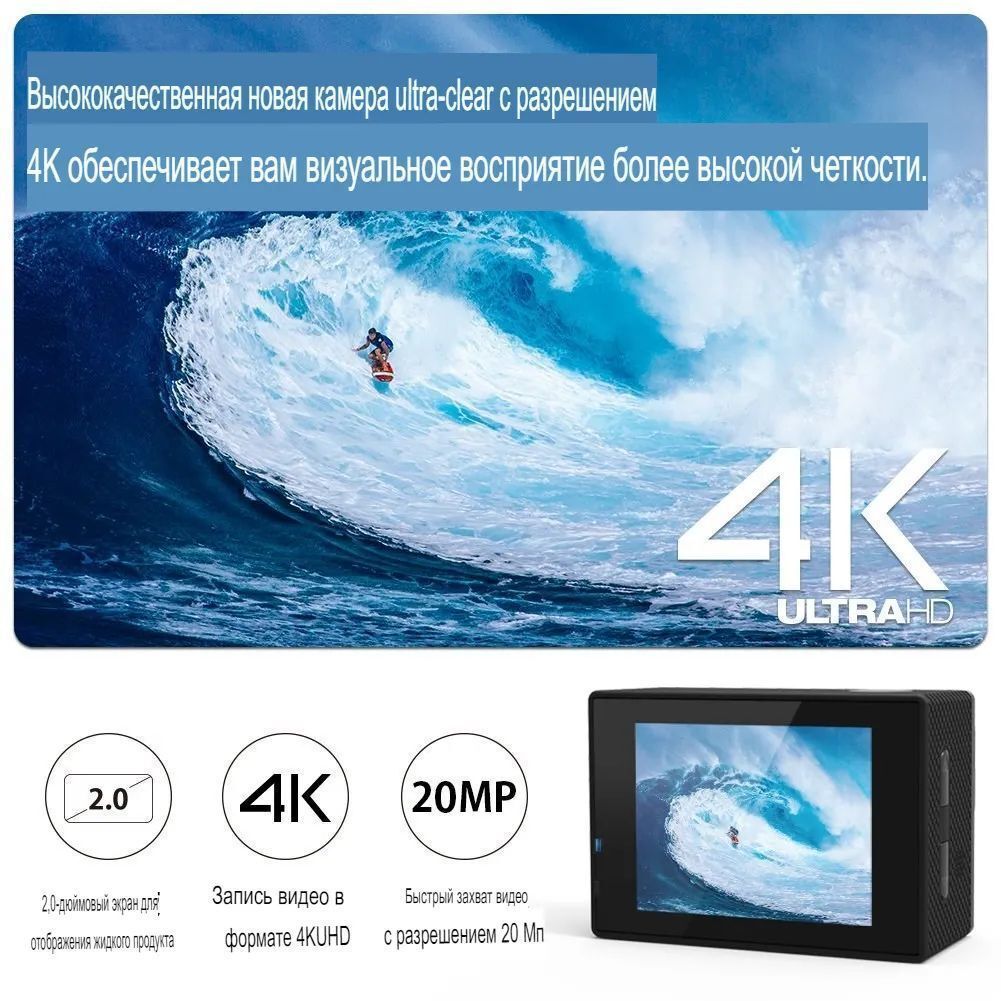 Экшн камера Ultra HD позволяет записывать видео с разрешением 4К и очень плавным изображением до 60 кадров в секунду. Камера оснащена 2" IPS экраном. Эта модель экшн-камеры сделана для любителей спорта на улице, подводного плавания, скейтбординга, скай-да