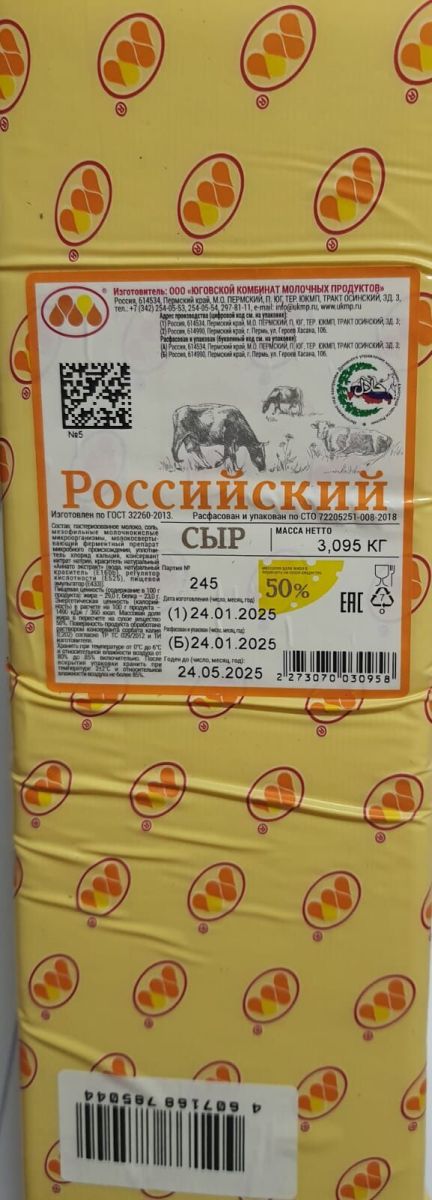 Бренд: Юговской, Вид сыра: твердый. Сорт: Российский Фасовка: брус 3,2 кг х4. Жирность: 50 %. Биологический знак качества: без заменителя молочного жира (БЗМЖ).